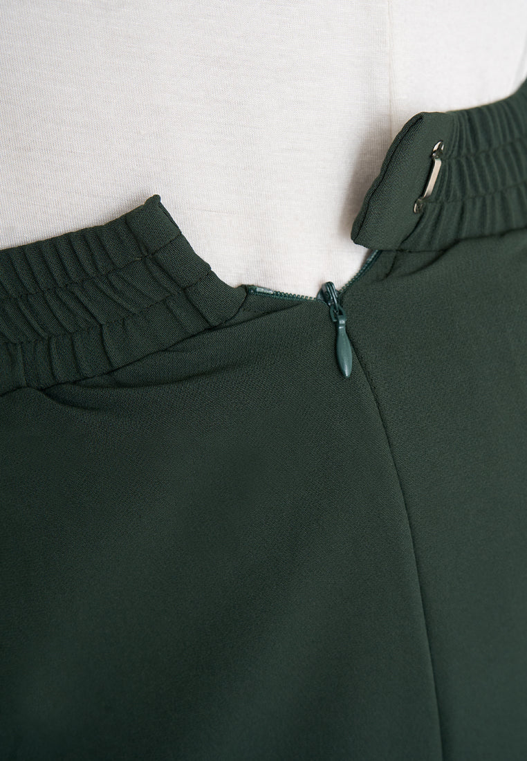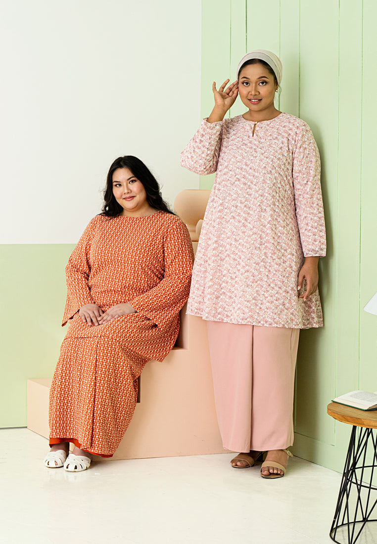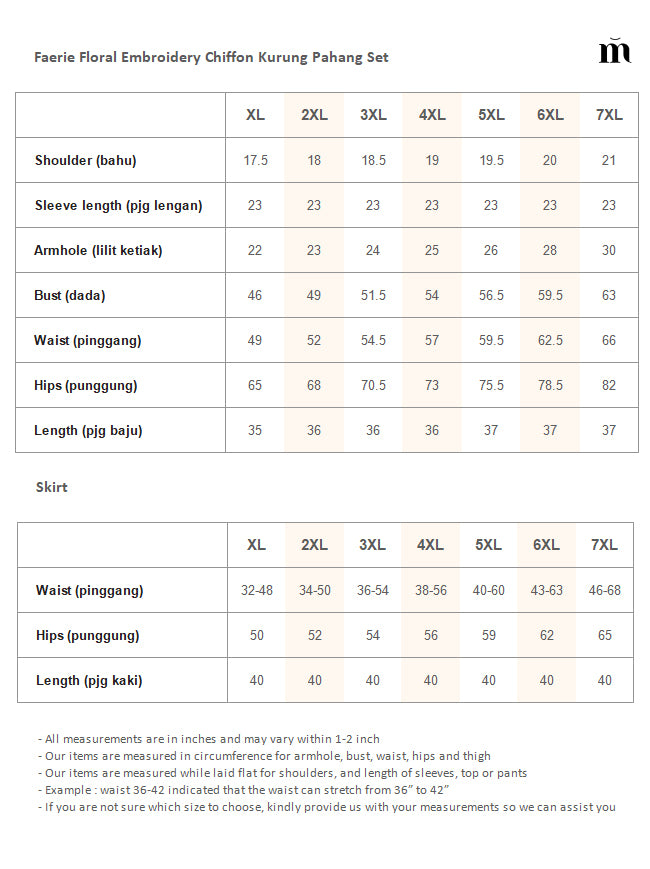 Round neck - Front button traditional kurung style - Long sleeves - Kurung Pahang top cutting with ample space for hips - Skirt with stretchable elastic waistband - Side hook and zip - Skirt with front folded design