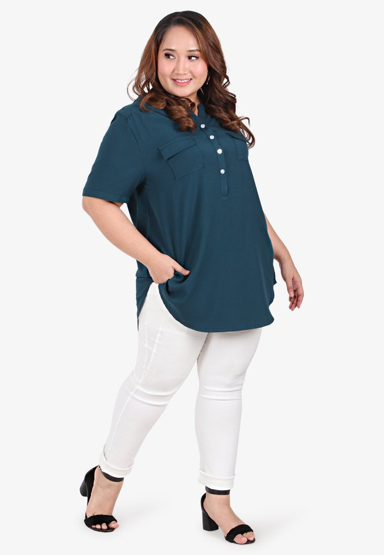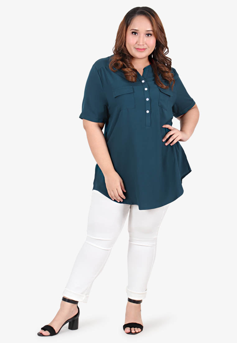 Stand collar - Short sleeves - Two front chest pockets - Lightweight drapey material