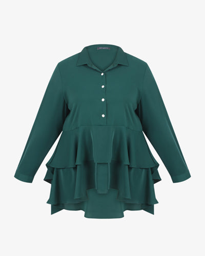 Collar - Half button - Peplum cutting layered drapes - Wrist cuff and button
