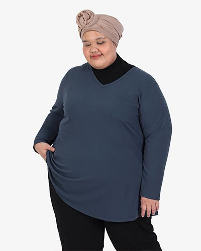 Perdita V-neck Pocket Ribbed Long Sleeve Tee - Blue