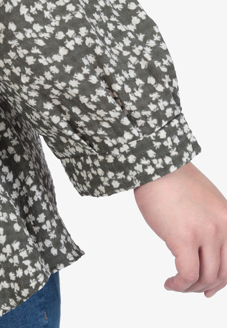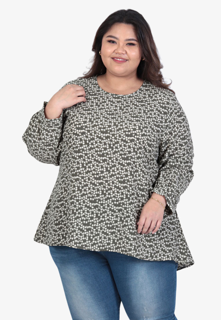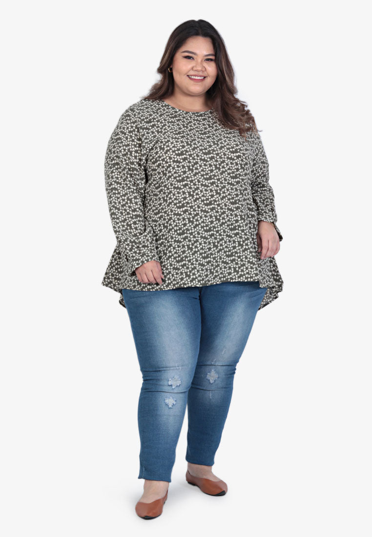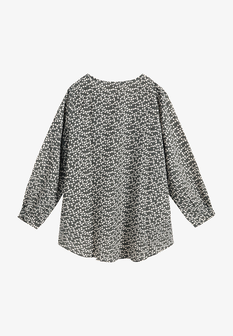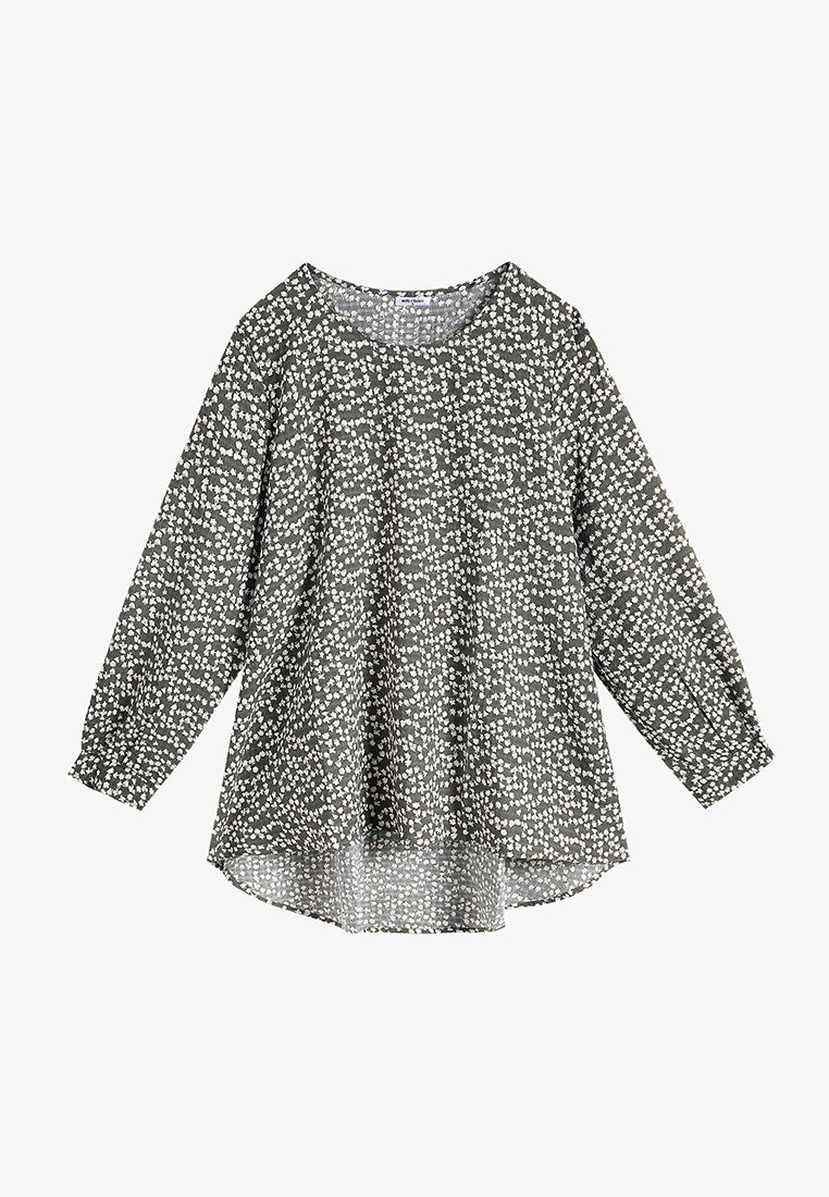 Round neck - Long sleeves with wrist cuff (no button) - High low hem