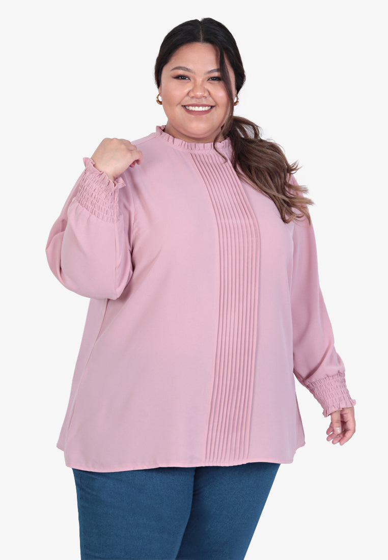 Frill round neck - Puff long sleeves - Gathered smocked wrist - Middle pleated design - Back neck button for easy wearing