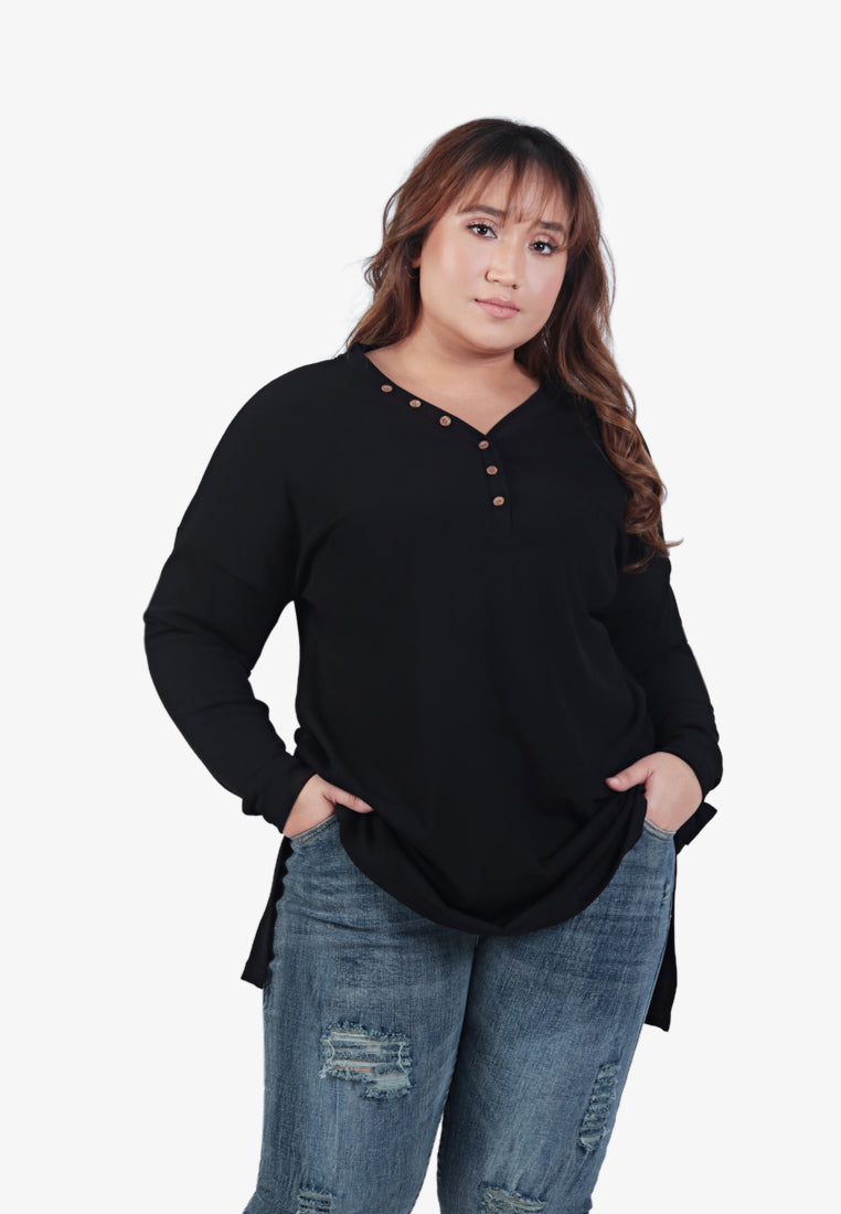 V-neck with fake buttons - Drop shoulder - 3 functional buttons - Long sleeves - Long length