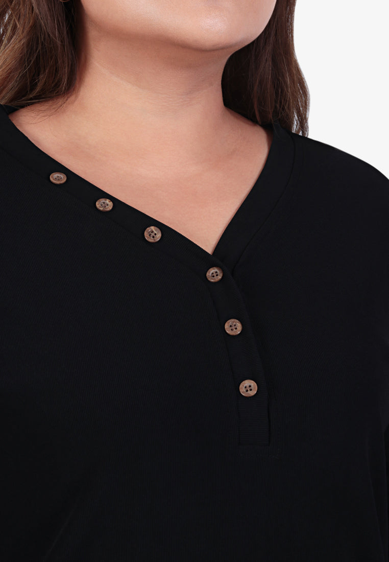 Beatricia V Neck Button Ribbed Top - Black