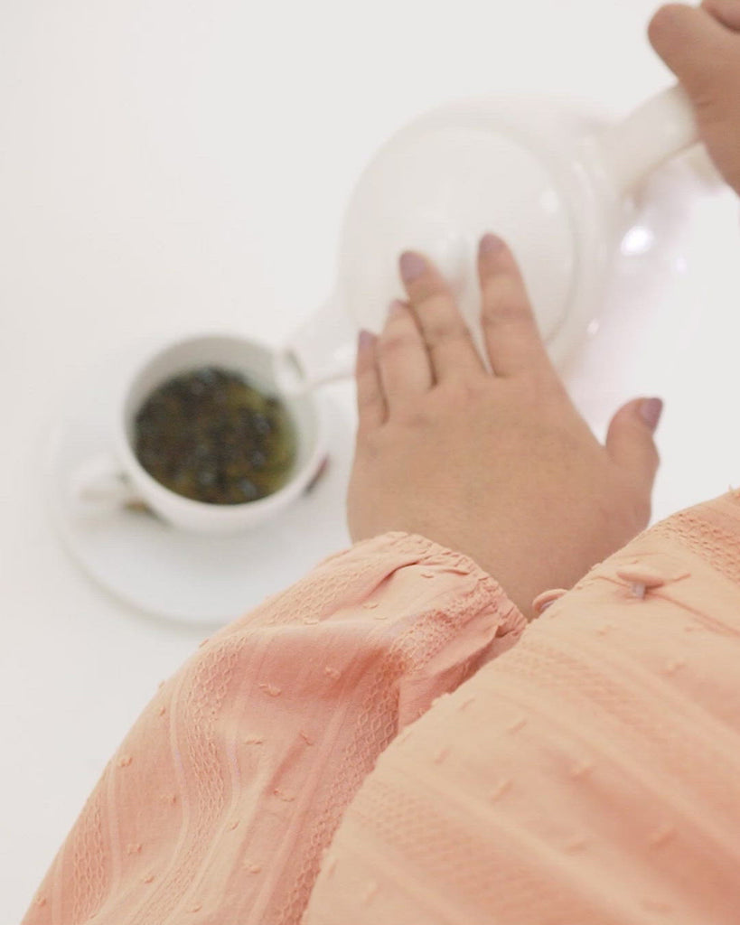 Round neck - Pull over style (only top button is real) - Fake button design - Raglan puff sleeves - Elastic wristband for easy wuduk or styling