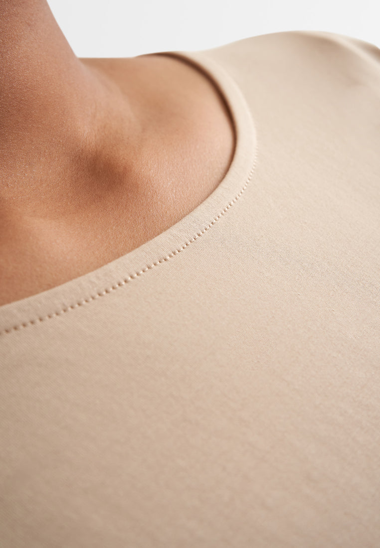 - Cotton jersey (soft, easy-iron, cooling)